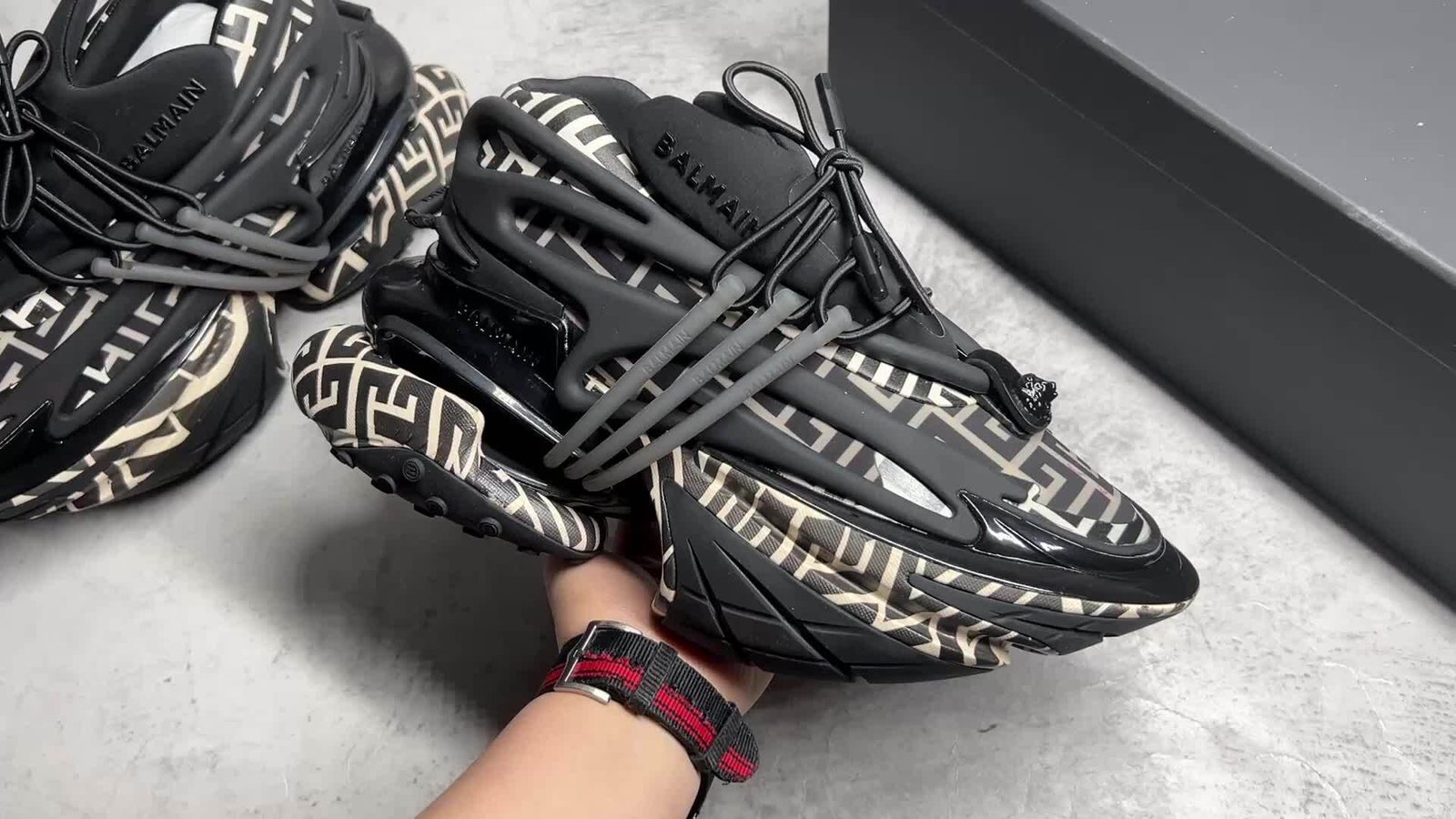 - Design: Lace fastening with decorative lion’s head-engraved press stud; contrasting Balmain logos on tongue, side, and heel​