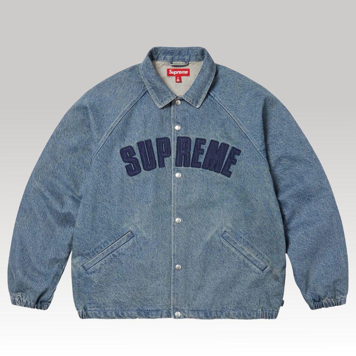 The Supreme Arc Denim Coaches Jacket from the Spring/Summer 2025 collection is a contemporary update on a classic coaches jacket silhouette, made for those who appreciate both style and durability. Constructed from 100% cotton 13 oz. denim, this jacket offers a sturdy yet comfortable feel. It features a snap front closure for convenience and welt hand pockets at the lower front for everyday practicality. The elastic cuffs and hem ensure a secure, comfortable fit, while the bold logo appliqué at the chest delivers unmistakable Supreme branding. This jacket is available in several colorways, including Black, Light Pink, Green, Red, and Blue.