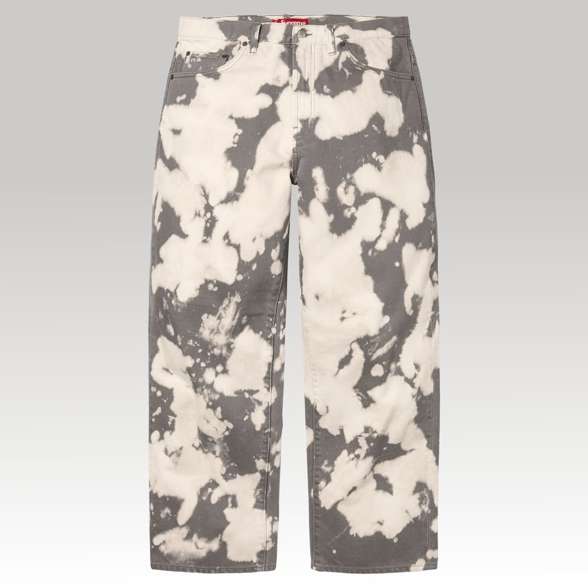 The Supreme Bleached Denim Trucker Pant is a bold release from the Spring/Summer 2025 collection, designed for those seeking a unique streetwear statement. Crafted from heavyweight cotton denim, these pants feature an allover bleached wash effect, resulting in a one-of-a-kind pattern on each pair. The classic five-pocket construction includes two front pockets, a coin pocket, and two back pockets, with a relaxed, straight-leg fit for comfort and versatility.