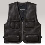 The Supreme Leather Cargo Vest is a premium, utility-inspired piece from the Spring/Summer 2025 collection. Crafted from rich black leather, this vest features a sleek, minimalist design with multiple functional pockets for storage and style. The front showcases a variety of cargo pockets, including two large zippered pouches at the waist, a flap pocket on the chest, and dual smaller flap pockets on the upper left side, all designed for practicality and aesthetic appeal.