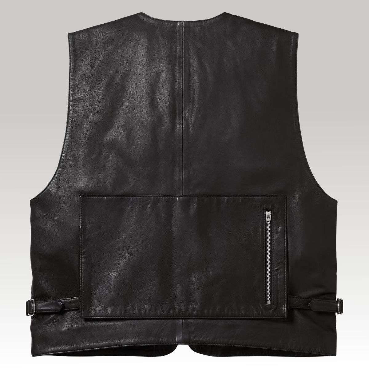 The back of the vest includes a large leather panel with a zippered pocket on the right side, adding to the vest’s cargo utility theme. Adjustable side straps with metal buckles allow for a customizable fit. The interior is fully lined for comfort, and the vest closes with a sturdy front zipper. This piece blends streetwear edge with rugged functionality, making it a versatile addition to any wardrobe.