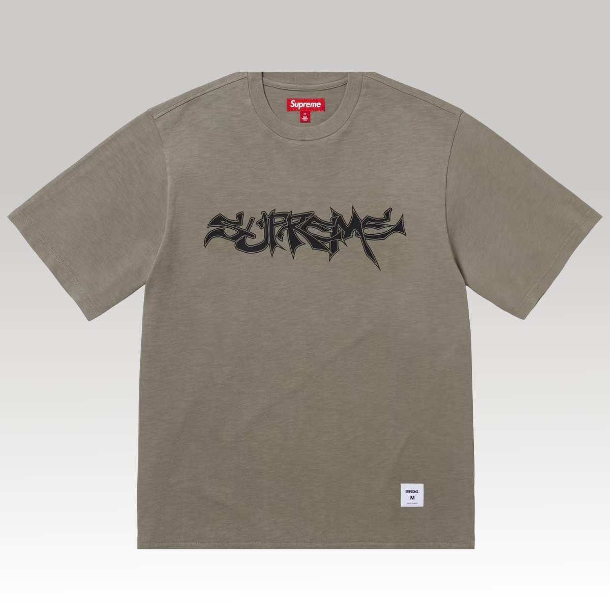 The Supreme Mental S/S Top is a short-sleeve t-shirt from the Spring/Summer 2025 collection. Made from 100% cotton, this tee features a relaxed fit and a soft, washed olive colorway. The standout detail is the large, graffiti-style “Supreme” logo printed across the chest in black, giving the shirt a bold streetwear edge. Additional details include a ribbed crewneck collar and a woven Supreme label at the lower front hem, adding a subtle touch of branding.