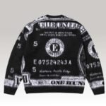 The Supreme Money Sweater is a bold statement piece from the brand’s collection, featuring an allover jacquard knit graphic inspired by the design of a US $100 bill. Rendered in striking blue and white, the sweater showcases intricate details from the currency motif across the front, back, and sleeves. It is crafted from a soft cotton blend, ensuring both comfort and a premium feel. The design is finished with ribbed cuffs, collar, and hem for a classic fit, and a subtle red Supreme tag at the side seam.