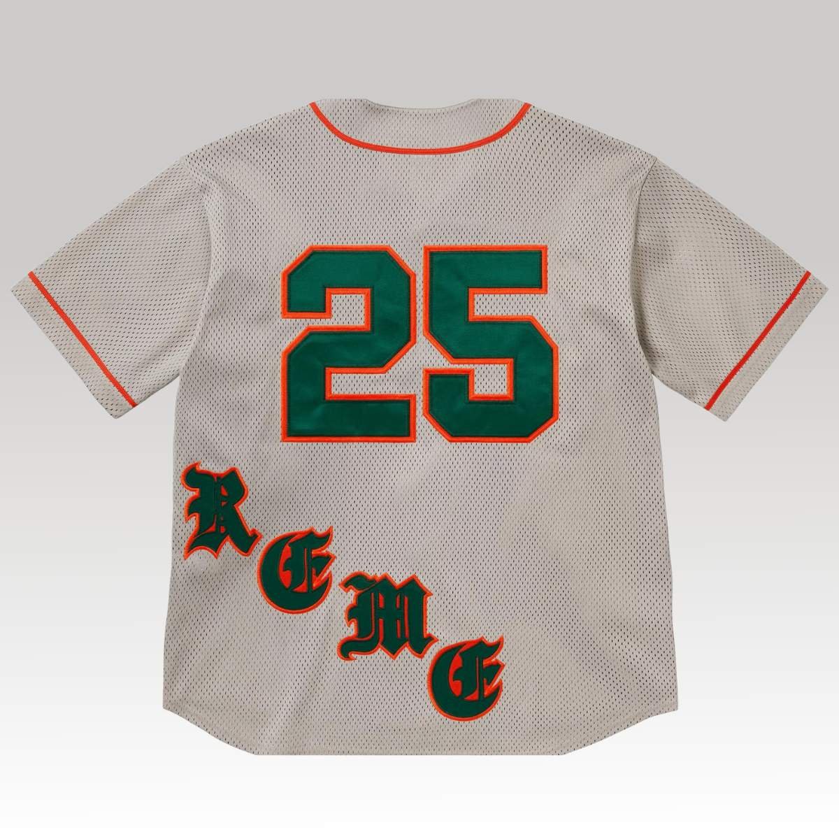 The Supreme Old English Baseball Jersey is a standout piece from the Spring/Summer collection, blending classic athletic style with bold streetwear branding. Crafted from breathable poly mesh, this short-sleeve jersey features a light grey base with striking orange piping along the collar, button placket, and sleeves. The front is decorated with a large “25” in green with orange outline, and oversized Old English “S U P” lettering, giving the jersey a vintage yet modern Supreme twist. A woven Supreme patch at the lower front completes the look.