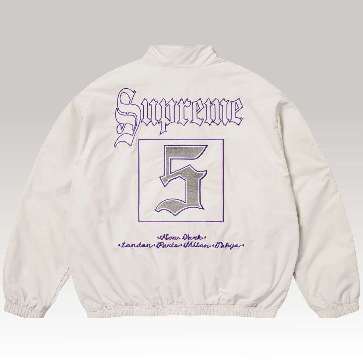 The Supreme Old English Track Jacket is a statement outerwear piece from the Spring/Summer collection, blending classic sportswear with bold branding. Crafted from lightweight nylon, this jacket features a relaxed fit and a full zip front closure. The front is adorned with a large, split “Supreme” logo in Old English lettering, adding a vintage, gothic-inspired flair. Additional details include the number “5” printed on the sleeve and hem, “NEW YORK” down the left arm, and a circular Supreme patch on the right arm. The jacket is finished with elastic cuffs and hem for a secure fit and two side hand pockets for practicality.